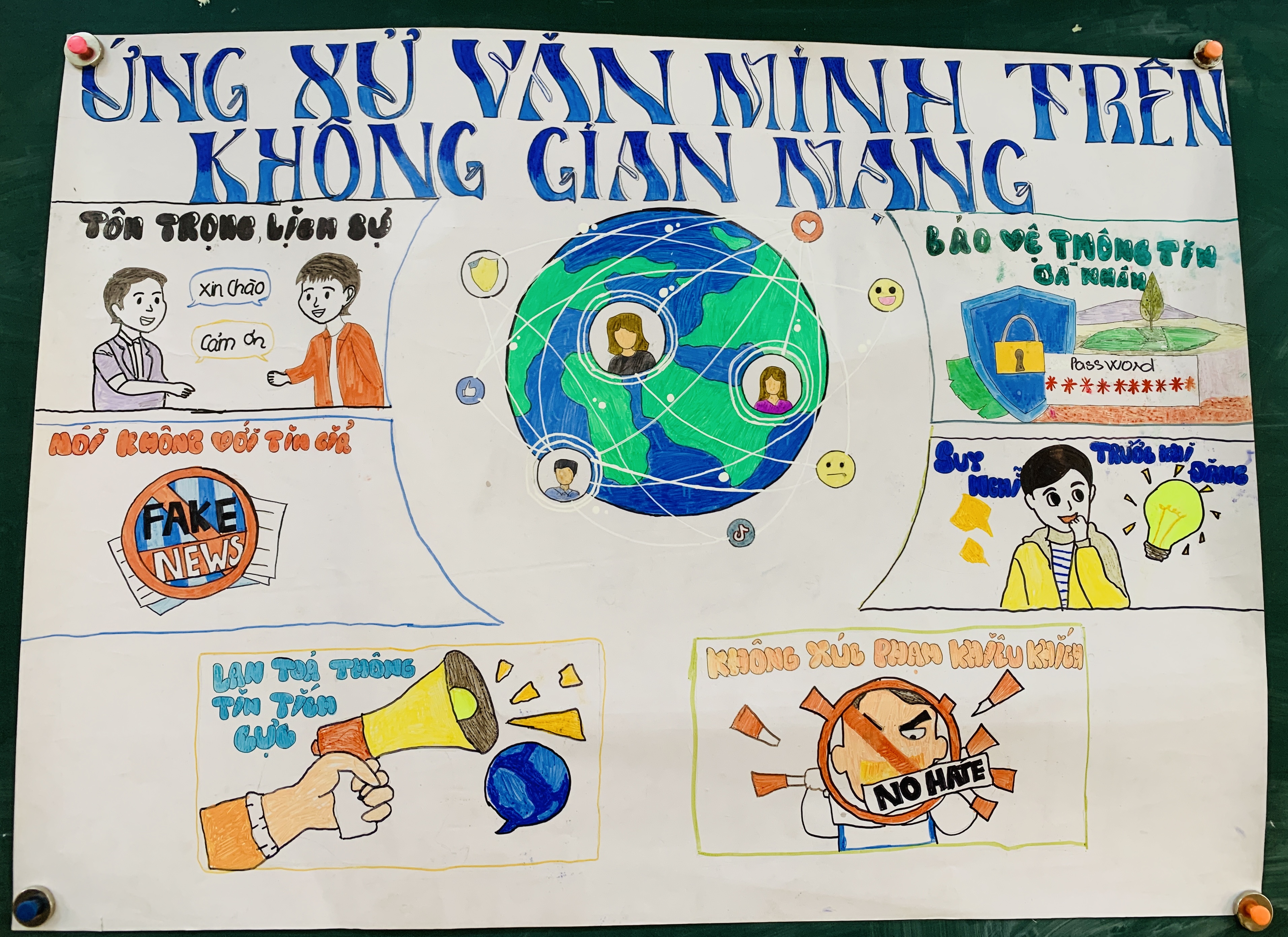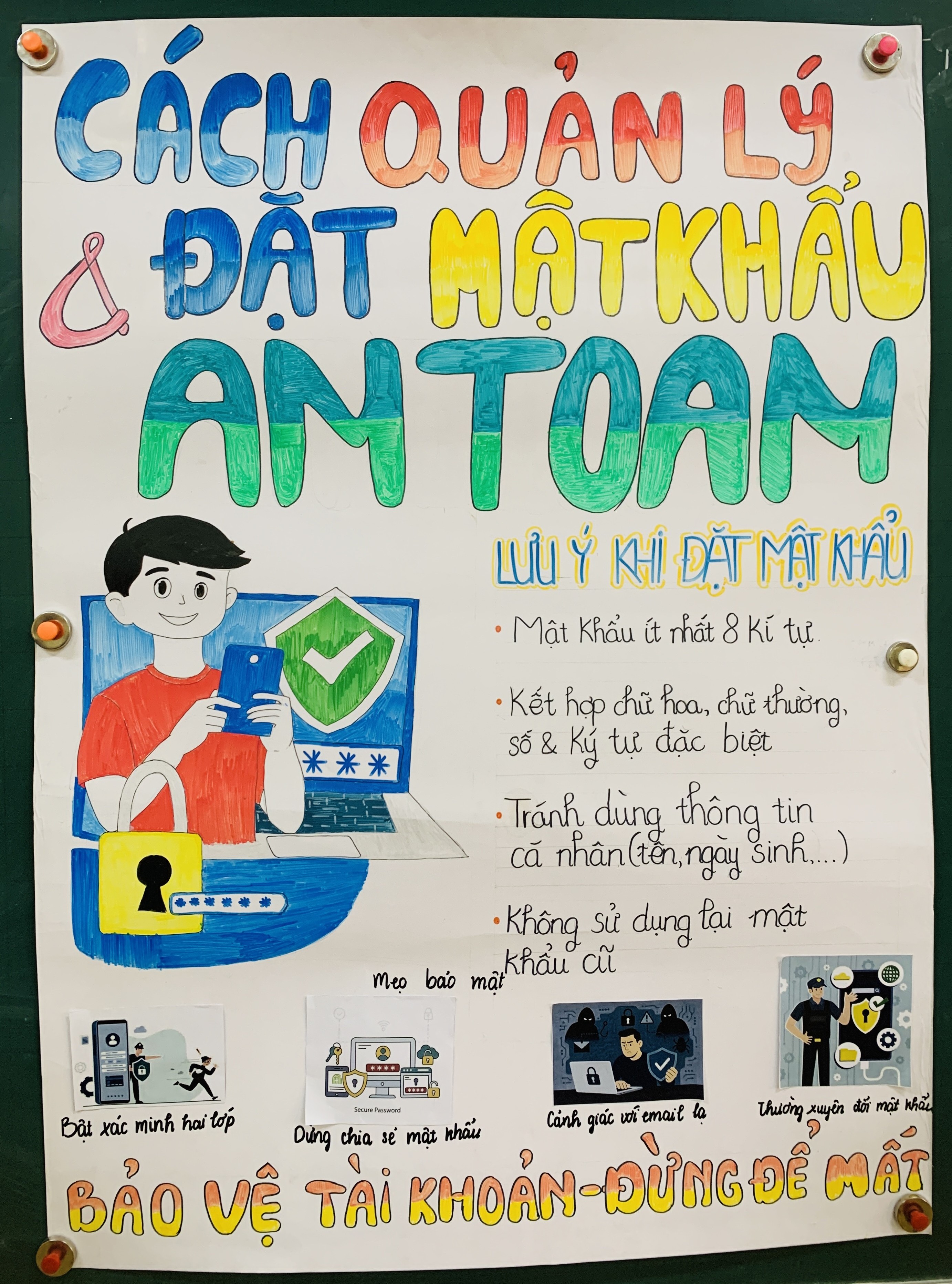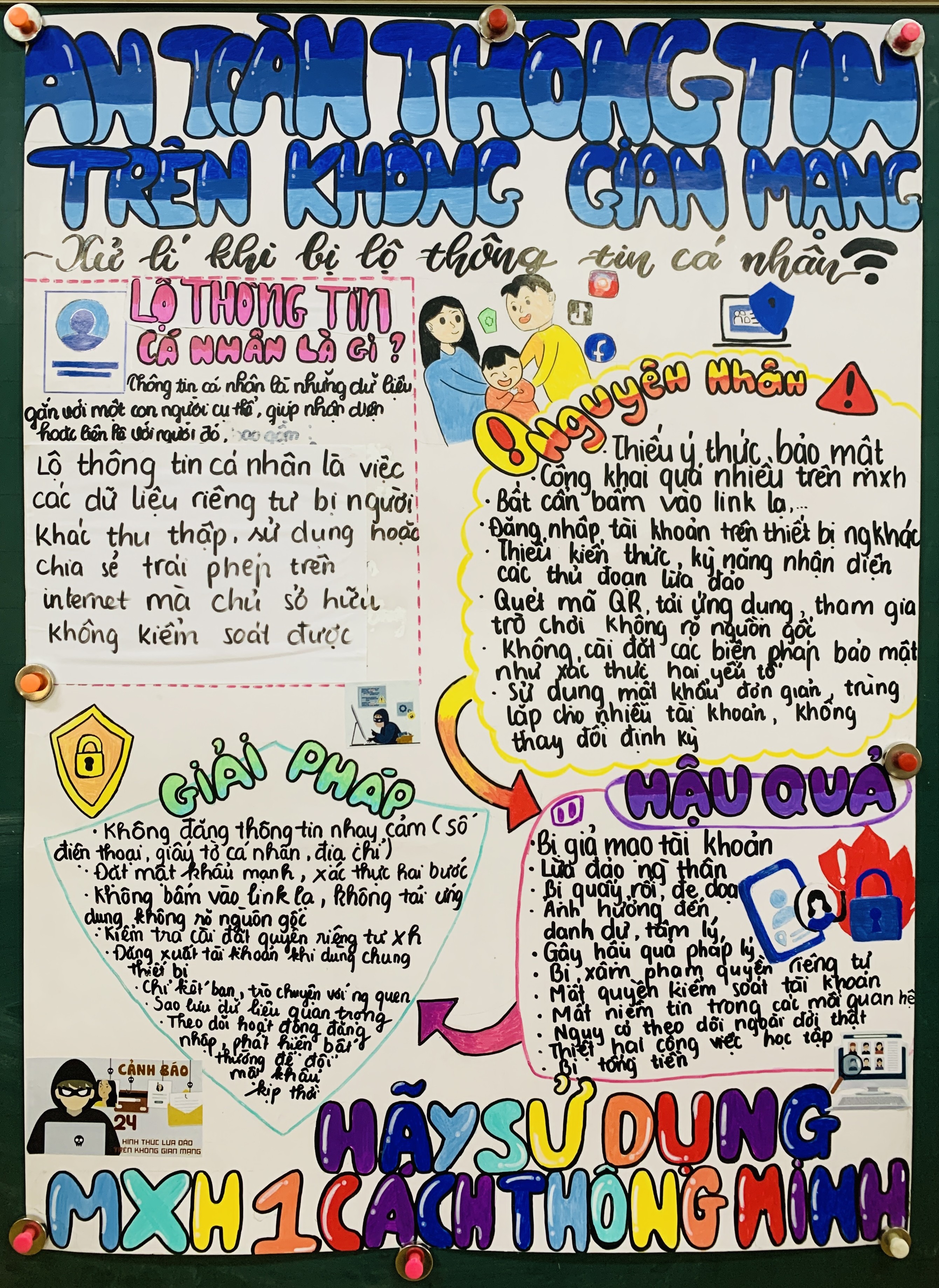 Dưới đây là một số POSTER và Video truyền thông Nâng cao năng lực “an toàn thông tin” trên không gian mạng cho học sinh do các bạn học sinh khối 12 thực hiện trong quá trình học tập chủ đề: “Đạo đức, pháp luật và ứng xử văn minh trên không gian mạng” giúp cho các bạn học sinh hiểu biết hơn các nguy cơ khi tham gia môi trường số, ứng xử an toàn, có trách nhiệm, bảo vệ bản và cộng đồng.